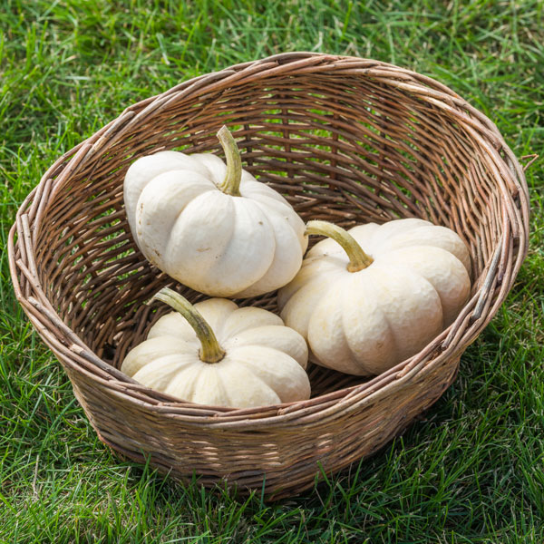 White mini pumpkins about the size of a tennis ball that will fit in the palm of your hand. A heavy cropper on long trailing vines 2-3 meters in length. Best harvested just prior to full maturity as skins can turn a pale yellow on full maturity. Ideal for Halloween or autumn displays.