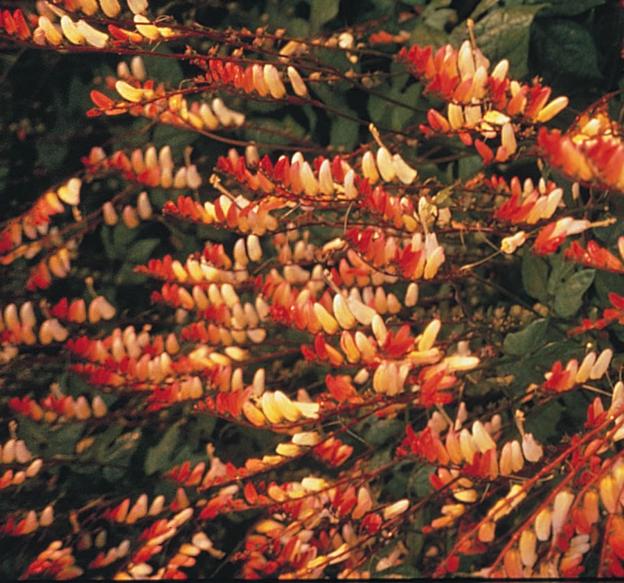 An easy growing climber for pots or covering trellis. If pinched out as it grows, it can also be used in hanging baskets. Showy colourful flowers on short spikes that start scarlet and slowly change through orange, yellow to white as it matures. Height 180cm (6ft). s/c 63 per g. Half Hardy Annual/Climber